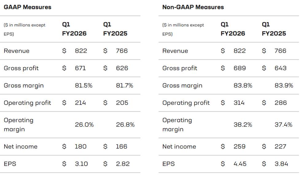O lucro líquido GAAP para o primeiro trimestre do ano fiscal de 2026 foi de US$ 180 milhões, ou US$ 3,10 por ação diluída, em comparação com US$ 166 milhões, ou US$ 2,82 por ação diluída, no primeiro trimestre do ano fiscal de 2025. O lucro líquido não GAAP para o primeiro trimestre do ano fiscal de 2026 foi de US$ 259 milhões, ou US$ 4,45 por ação diluída, em comparação com US$ 227 milhões, ou US$ 3,84 por ação diluída, no primeiro trimestre do ano fiscal de 2025.